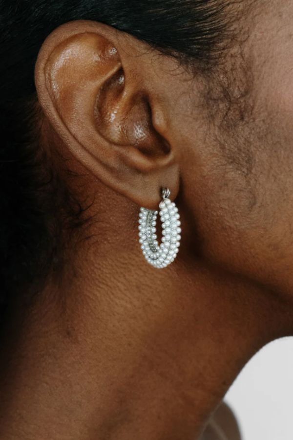 With delicate inlaid glass pearls, these hoops blend classic charm with contemporary style. Featuring a secure click closure, they offer subtle sophistication for any occasion.
