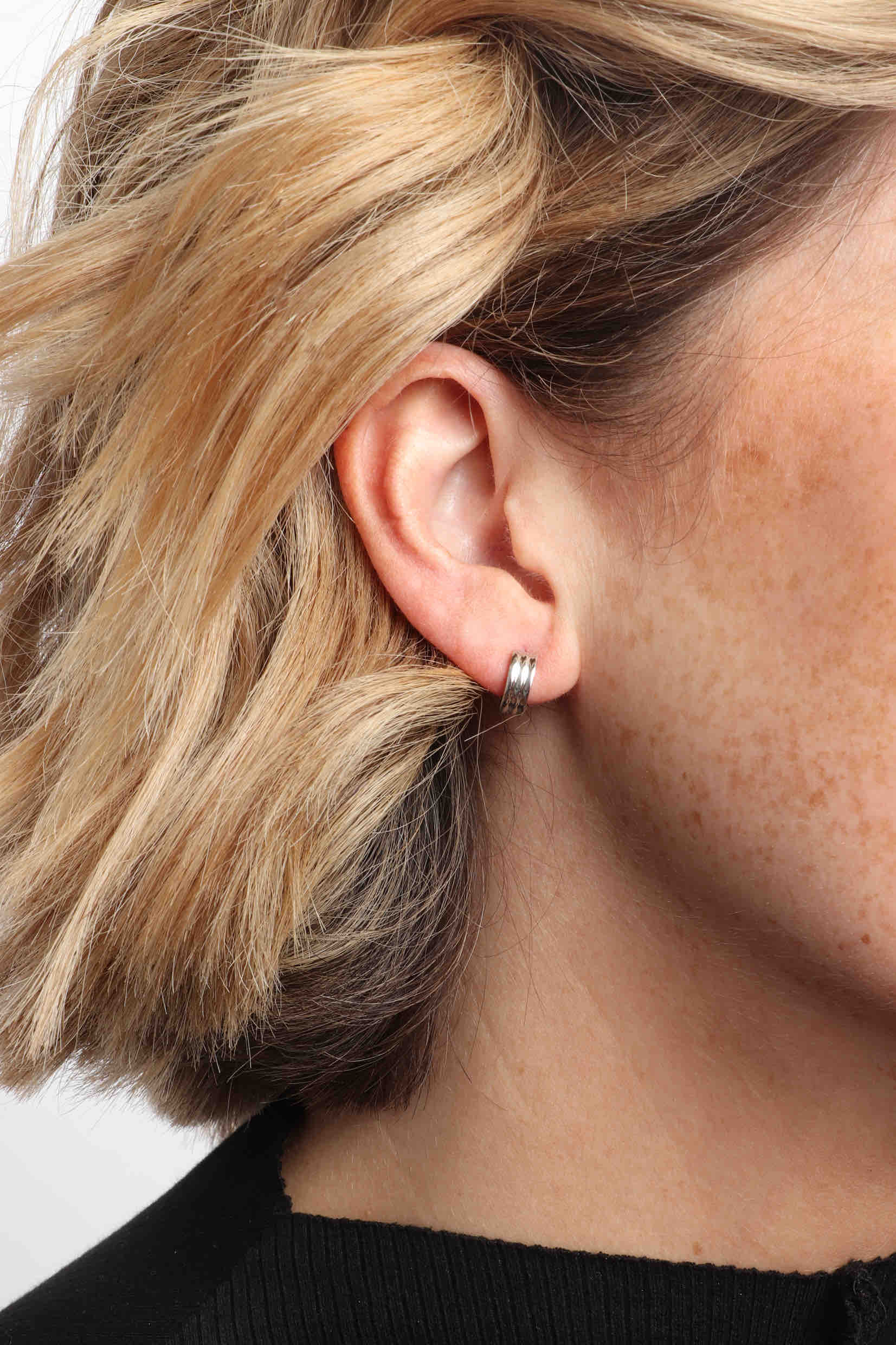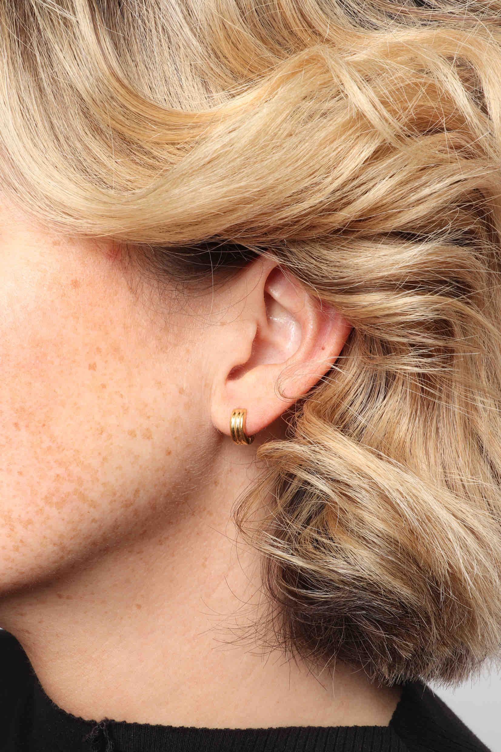 These triple band mini huggie hoop earrings feature a sleek design that showcases three elegantly intertwined bands for a modern touch. Their compact size and secure fit make them a versatile accessory.